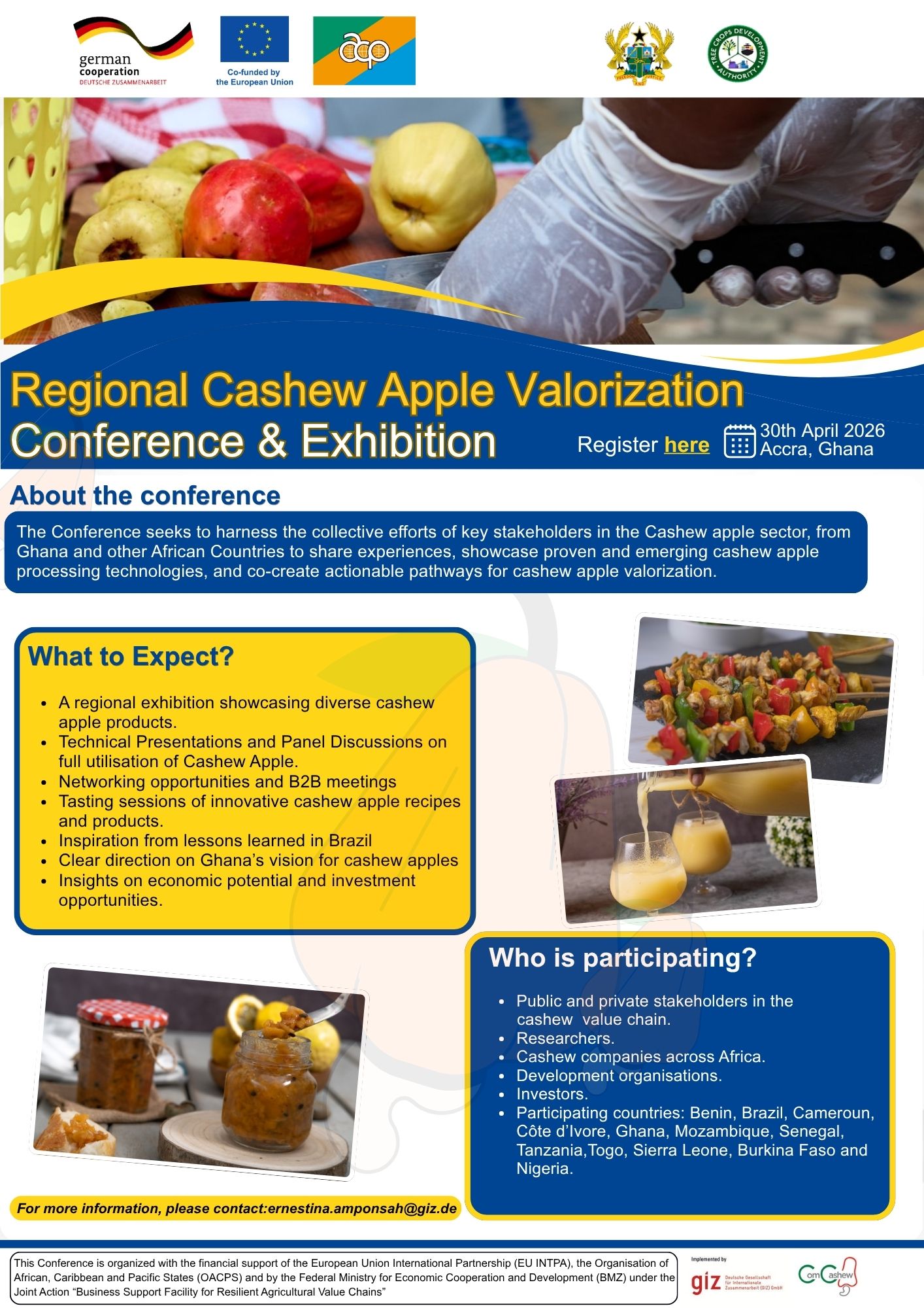 After having built a basis for the cashew sector in some African project countries through trainings for farmers and processors and through activities linking them to national and international markets, ComCashew aims now to consolidate these efforts and extend activities to the ECOWAS countries and the Caribbean and Pacific states. Agribusiness Facility (ABF) and MOVE-ComCashew, both GIZ programmes commissioned by the German Federal Ministry for Economic Cooperation and Development (BMZ) and co-funded by the EU under the post-Cotonou agreement with the Organization of ACP States have come together on the joint action, ‘ Business Support Facility for Resilient Agricultural Value Chains.